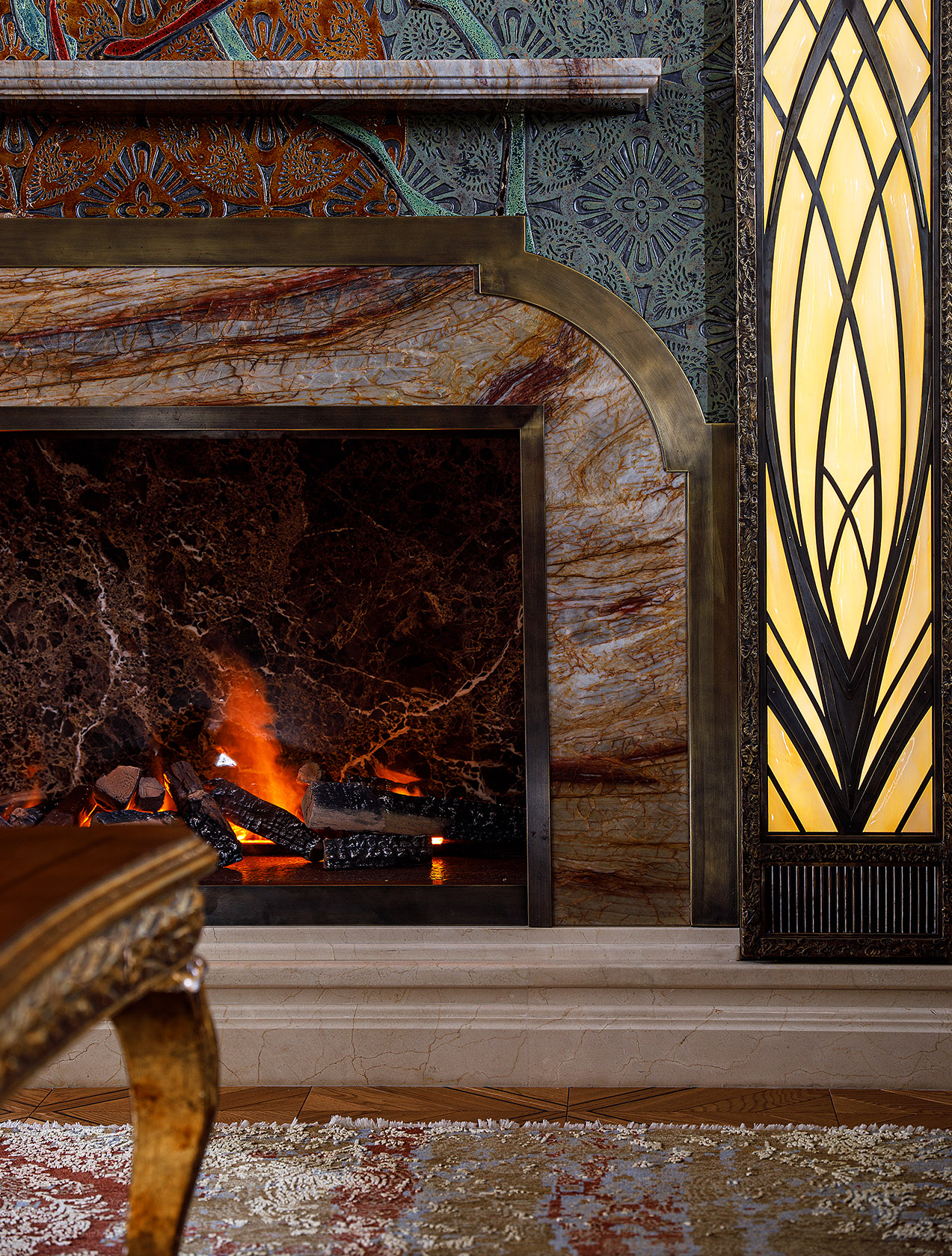 Керамика, латунь, кварцит Nacarado, мрамор Crema Marfil, мрамор Emperador Gold, витраж: