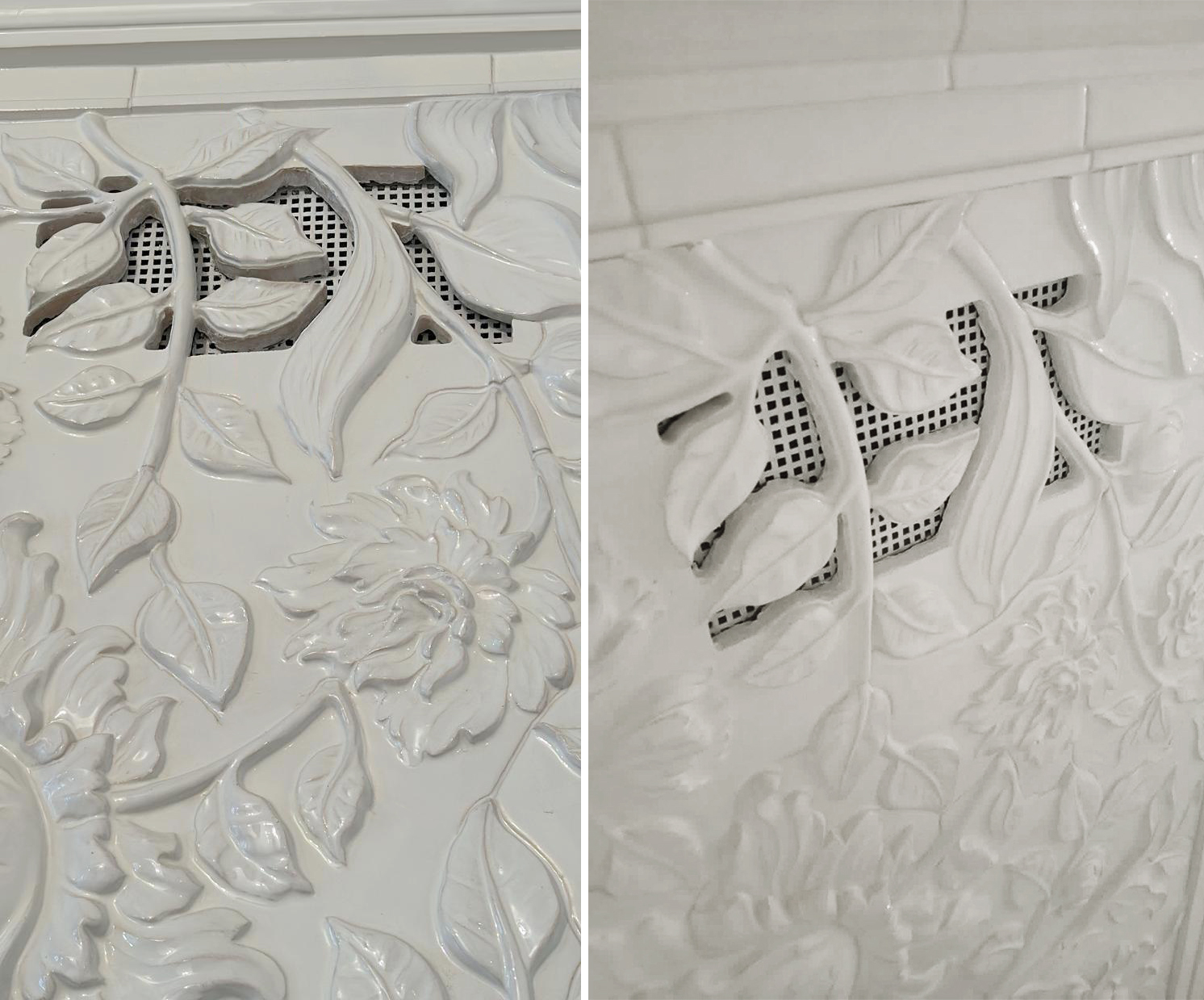 Вентиляционные решетки каминов, зачастую упускаемые из виду, в нашем исполнении превращаются в неотъемлемую часть общей художественной концепции, гармонично вплетаясь в рисунок керамики.